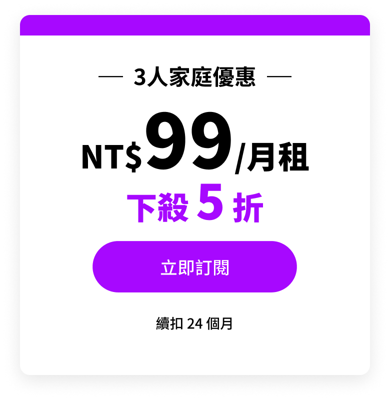 購買「3 人標準音質家庭月租方案」,可享有 KKBOX 最高 320 Kbps 標準音質服務,訂閱期間將以每月 NT$99 續扣 24 個月,每月享相較原價便宜 NT$100 之折扣,24 個月內期間無法退租,第 25 個月起每月續扣 NT$189。家庭方案適用最多 3 位同居家庭成員,包含戶長 1 人與成員最多 2 人。本優惠方案不包含 KKTV 的服務使用,訂閱前請特別留意!