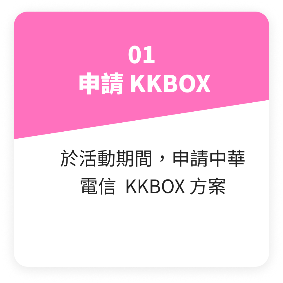 中華電信用戶於活動期間於中華電信全通路申請 KKBOX指定方案(不含小額付費,包含首三月 0 元方案及年約方案),並登入 KKBOX 完整播放任一首歌曲,且於抽獎當下仍須為有效付費狀態,始具備抽獎資格。
