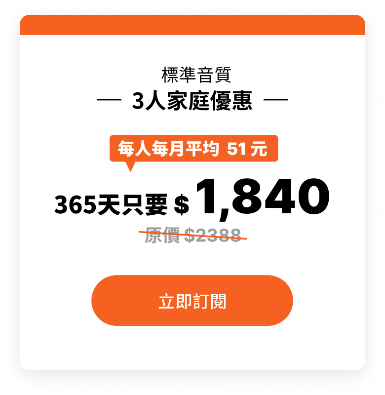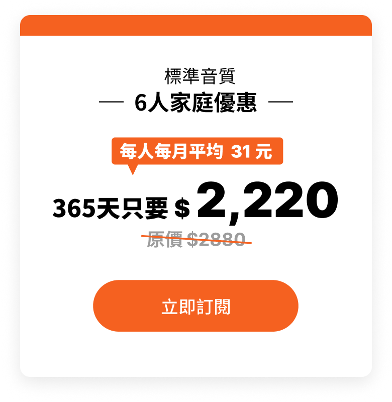 5. KKBOX 『6 人家庭方案 - 標準音質』適用於最多 6 位同居家庭成員,包含戶長 1 人與成員最多 5 人;『3 人家庭方案 - 標準音質』適用於最多 3 位同居家庭成員,包含戶長 1 人與成員最多 2 人,並提供最高 320 Kbps 標準音質。