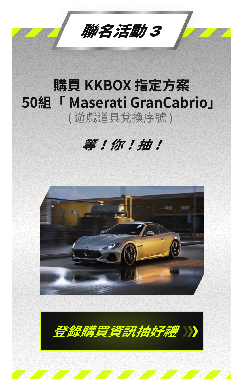 於活動期間,於KKBOX購買「KKBOX 2024 週年慶 指定方案」或「KKBOX 無損音質年終優惠」(詳細方案請參考下列),並於此活動頁中,點擊聯名活動3「登錄購買資訊抽好禮」,在相關頁面登錄發票及抽獎資料,就有機會抽中「《極速快感:集結》 - Maserati GranCabrio 遊戲道具序號」(限量:50組,每個KKBOX帳號最多只能抽到一次獎項)。
