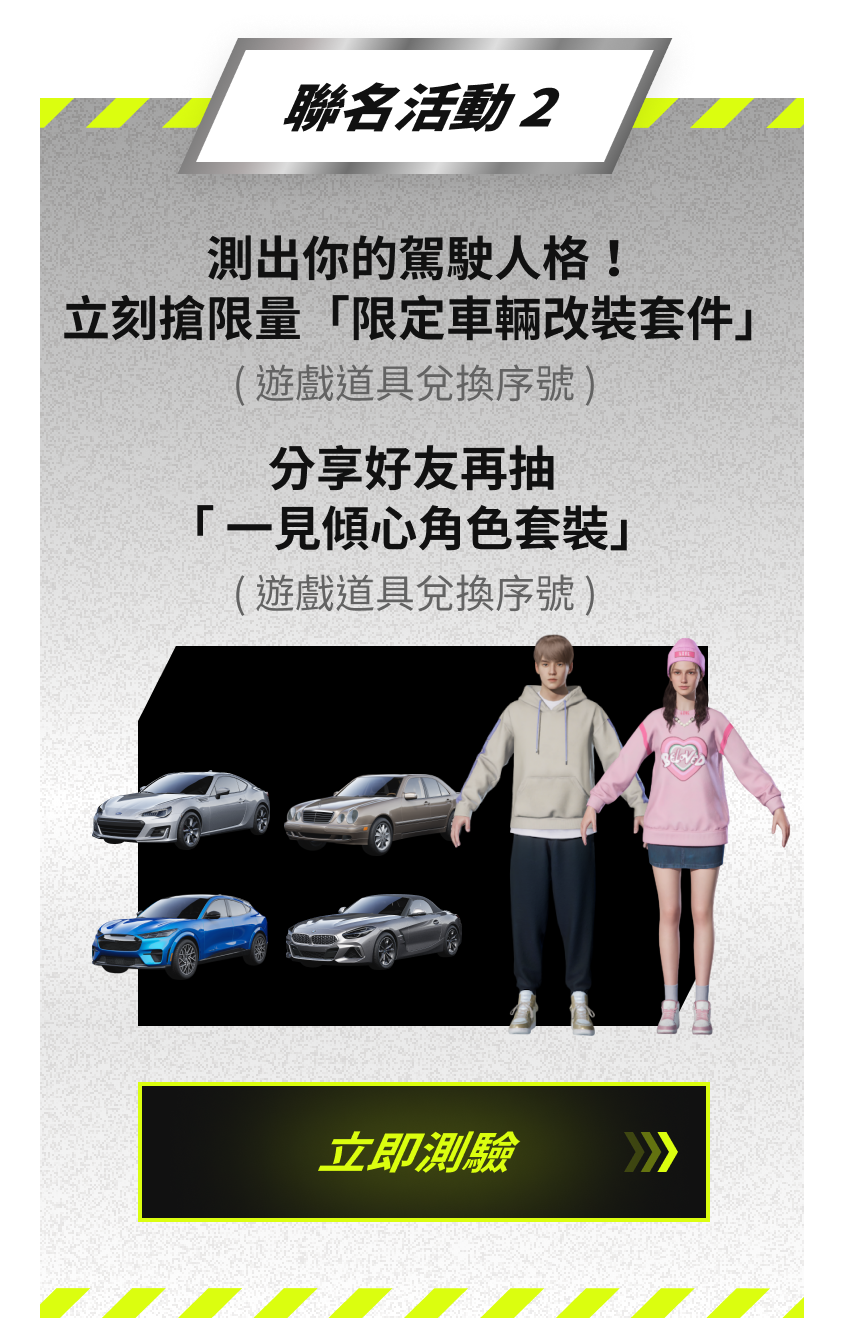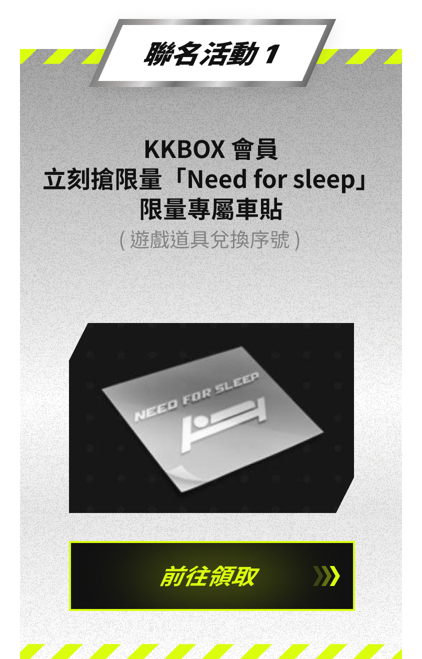 1. 參加測驗獎:於活動期間,點擊此活動頁中聯名活動2:「立即測驗」,登入KKBOX會員並完成測驗後,即可獲得「《極速快感:集結》- 車輛改裝套件 遊戲道具序號」