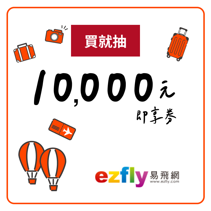 凡購買任一方案,即可抽「ezfly易飛網即享券」一萬元(共5組),可自選機票或行程!