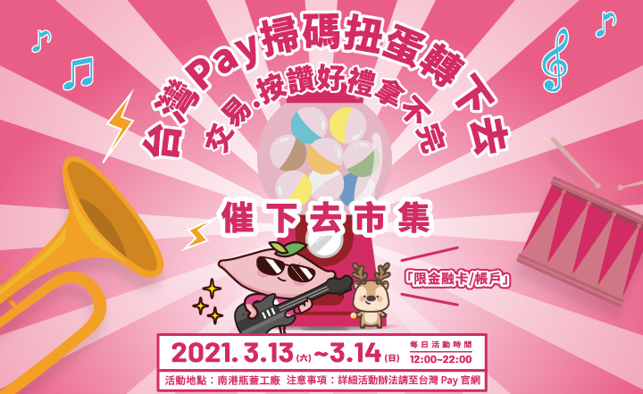 用戶於活動期間內,至「台灣 Pay 活動攤位」出示當日於活動地點消費之台灣 Pay 成功交易畫面,即可獲得一次轉扭蛋機會,一筆成功交易可享一次轉扭蛋機會,以此類推,每日共計200名中獎名額。