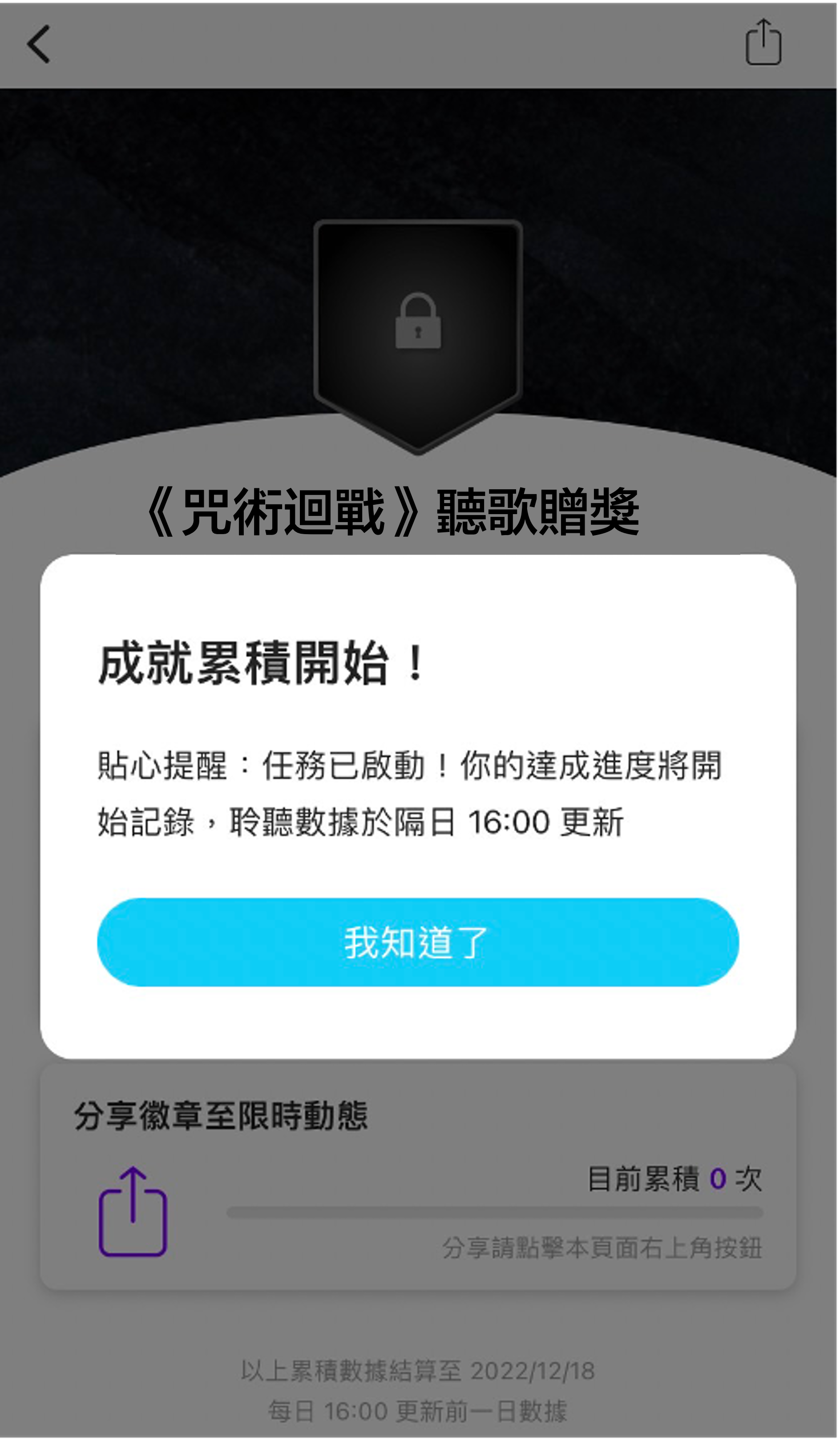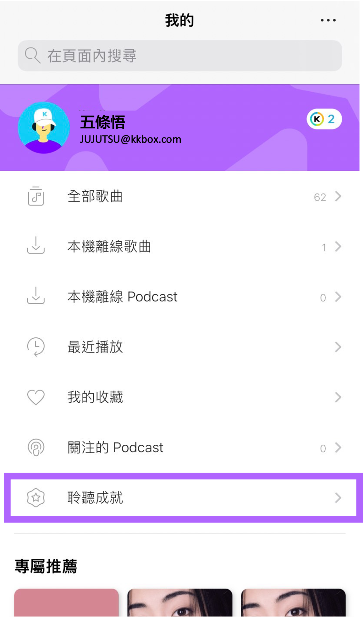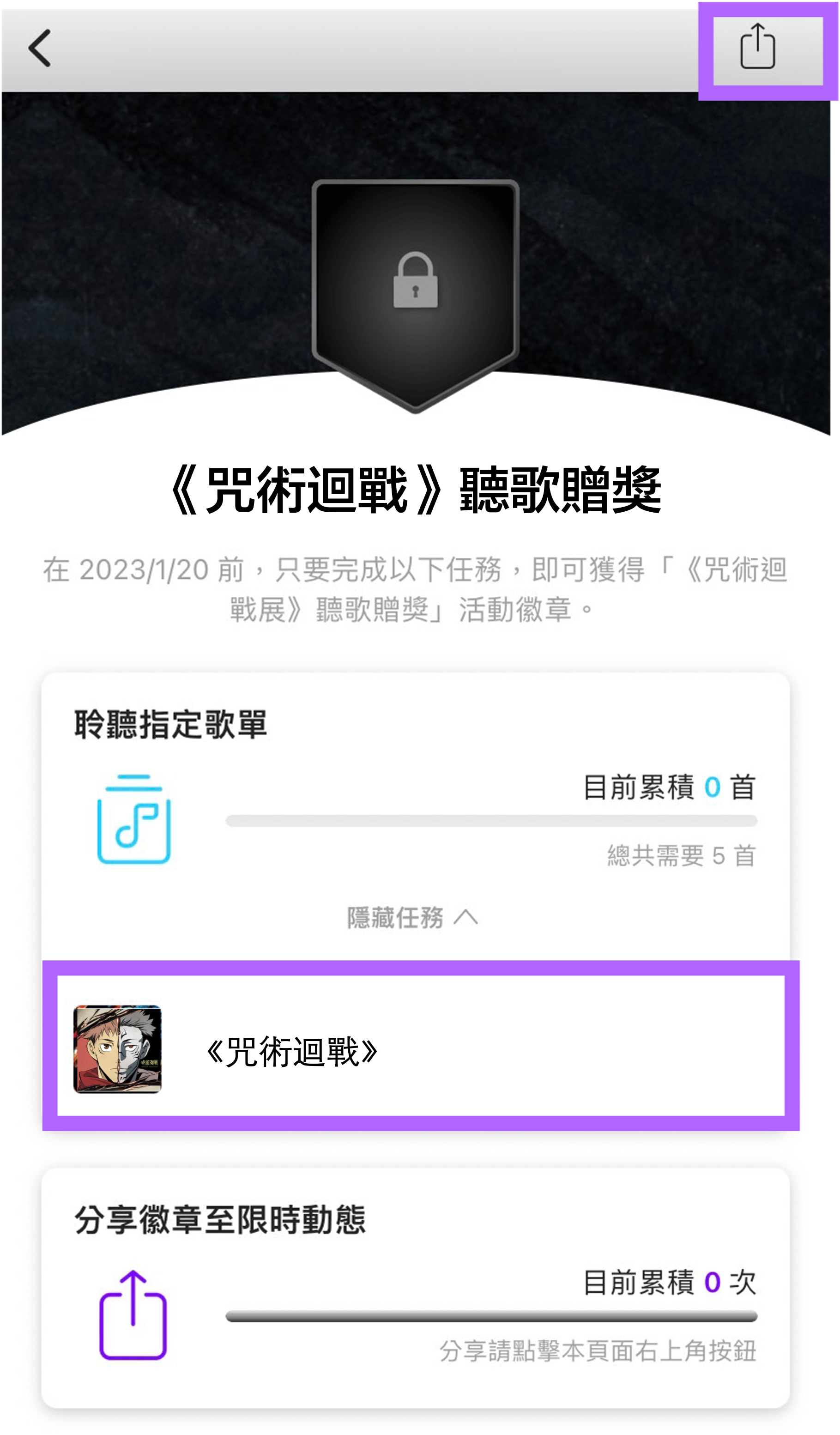 將 KKBOX 更新至最新版本,開啟 APP 前往左下方列表「我的」頁面,點選「 聆聽成就 」,完成聽歌任務解鎖「咒術迴戰聽歌贈獎」徽章,即可獲得抽獎資格。