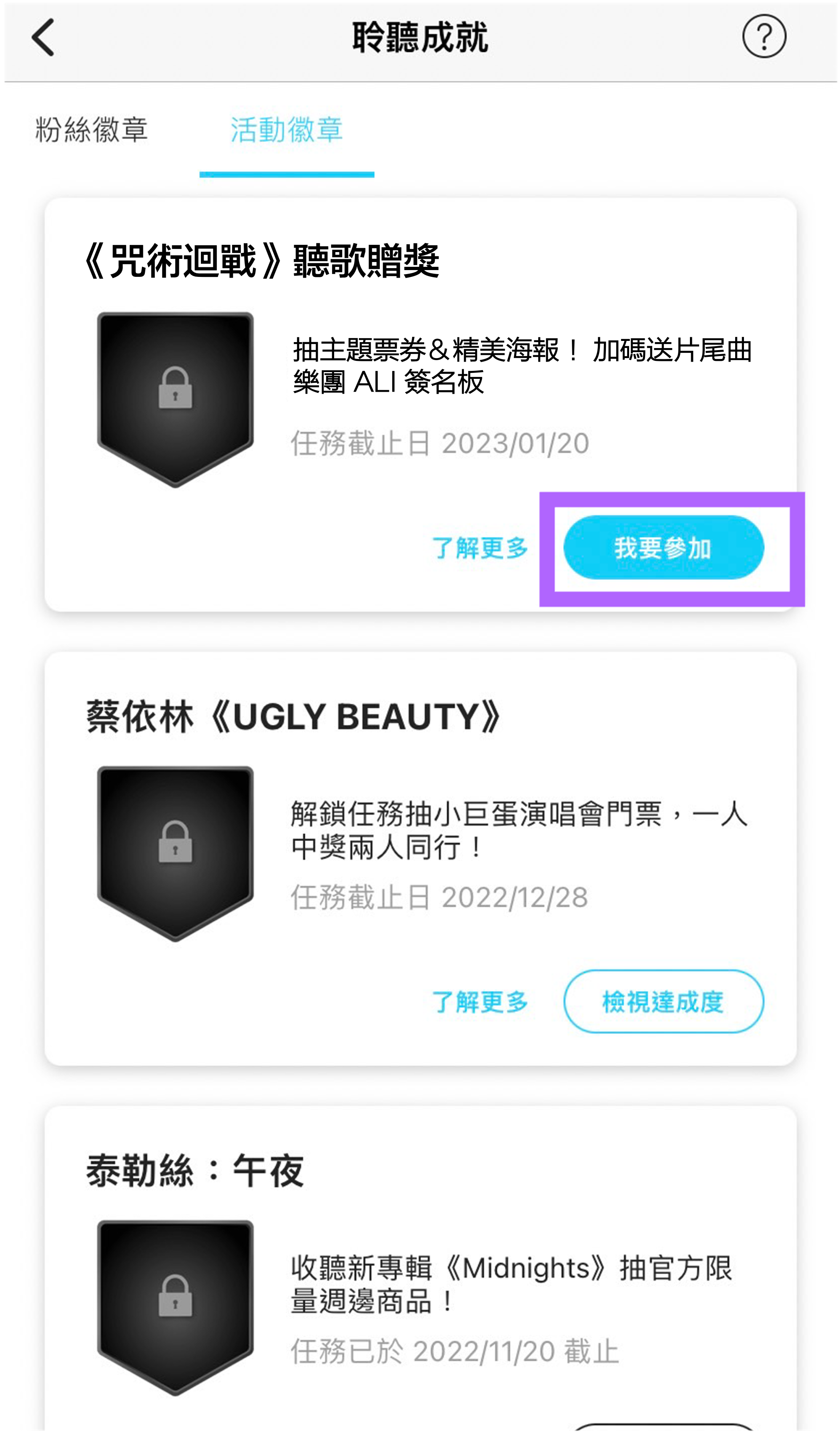 2. 聆聽次數計算:即日起至 KKBOX APP 「活動徽章」點擊「我要參加」,即開始計算