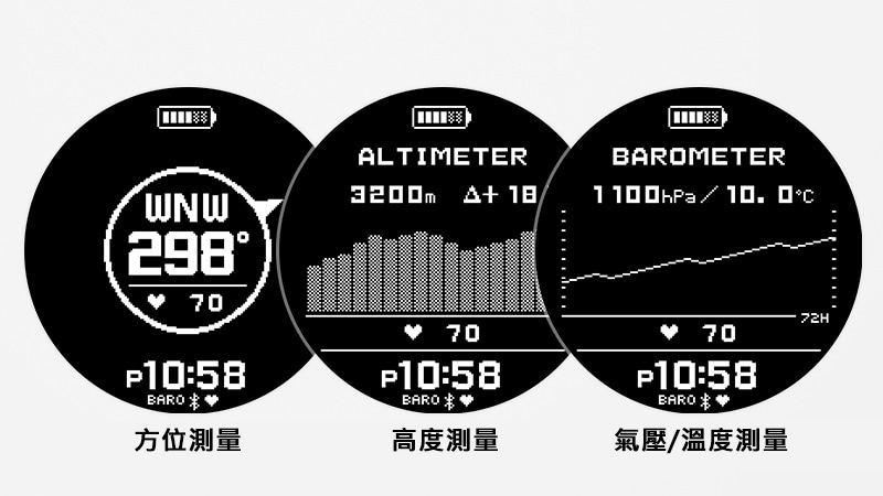 內建的小型感應器可測量高度、氣壓、方位及溫度,方位和高度資訊有助於提高GPS測量距離的準確性。