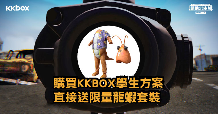 於 2019 年 11 月 22 日至 2019 年 12 月 22 日間,購買 KKBOX 青年學生方案,並完成線上資料登錄後,加碼再贈 PUBG MOBILE:絕地求生 M 限量虛寶「假日龍蝦頭飾+套裝」。 數量有限,送完為止!