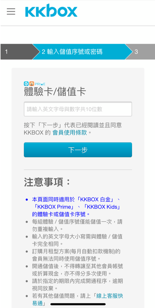 輸入從「眼明手快.翻牌挑戰賽」得到的 KKBOX 10天體驗序號後,點擊「下一步」