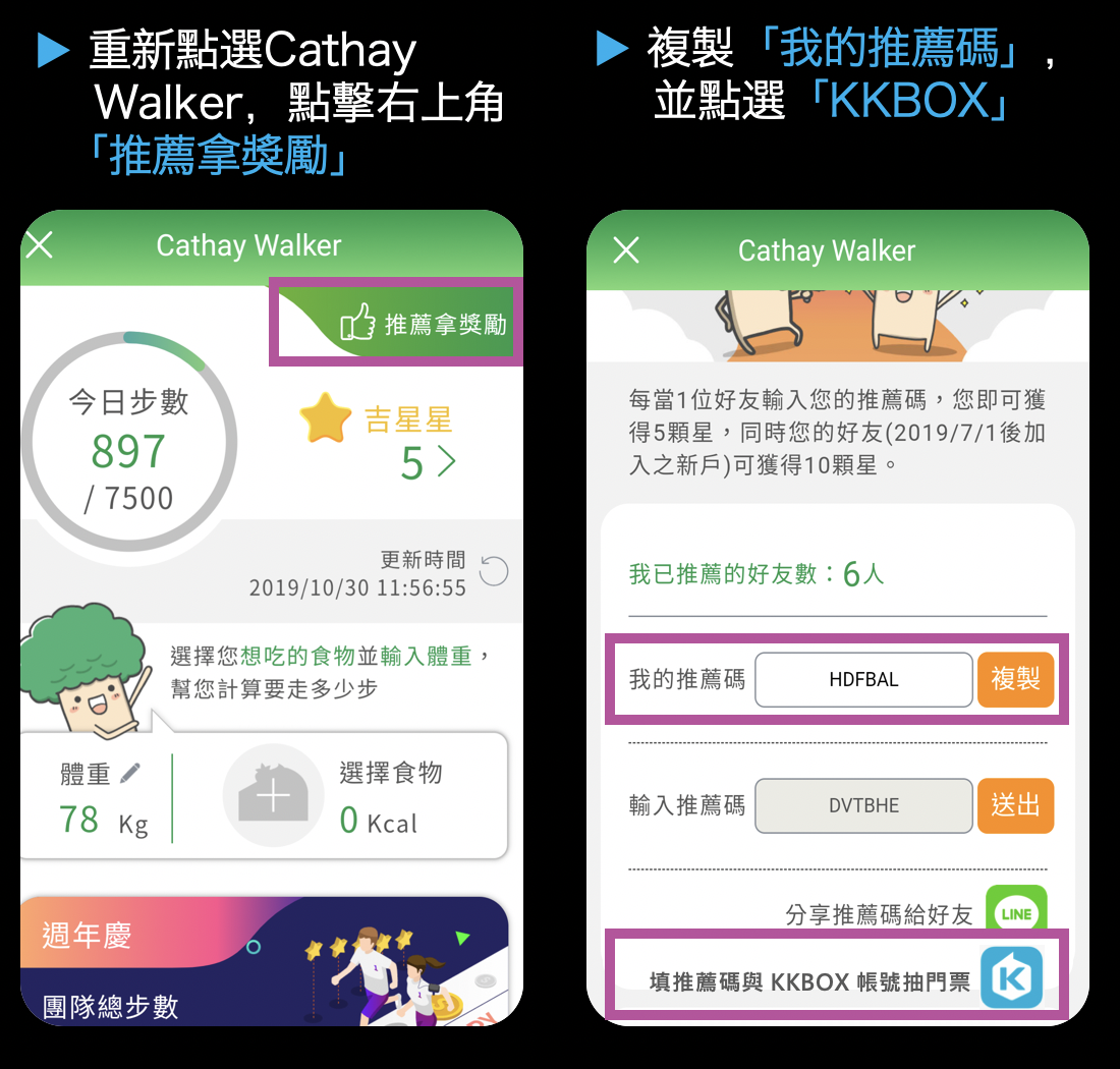 6.本活動 Cathay Walker 推薦碼限使用一次,如遇重複之Cathay Walker推薦碼,主辦單位將依使用時間先後判別給予參加者獎項。