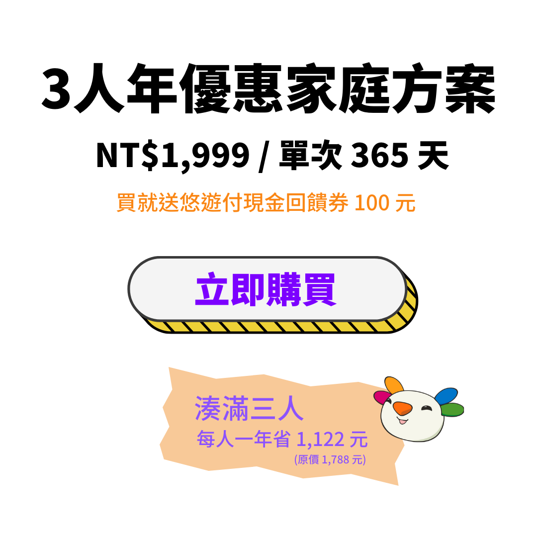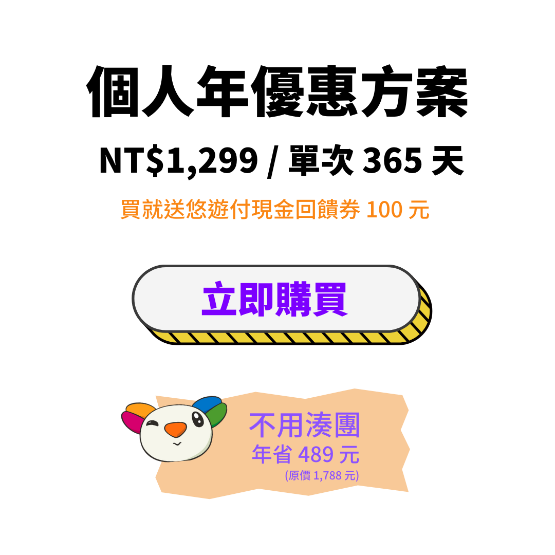 14. 本活動提供之個人年優惠方案 (365天) 原價 1,788 元,本活動提供 72 折優惠價 1,288 元;再送 100 元指活動回饋之「100 元線上購物禮包」