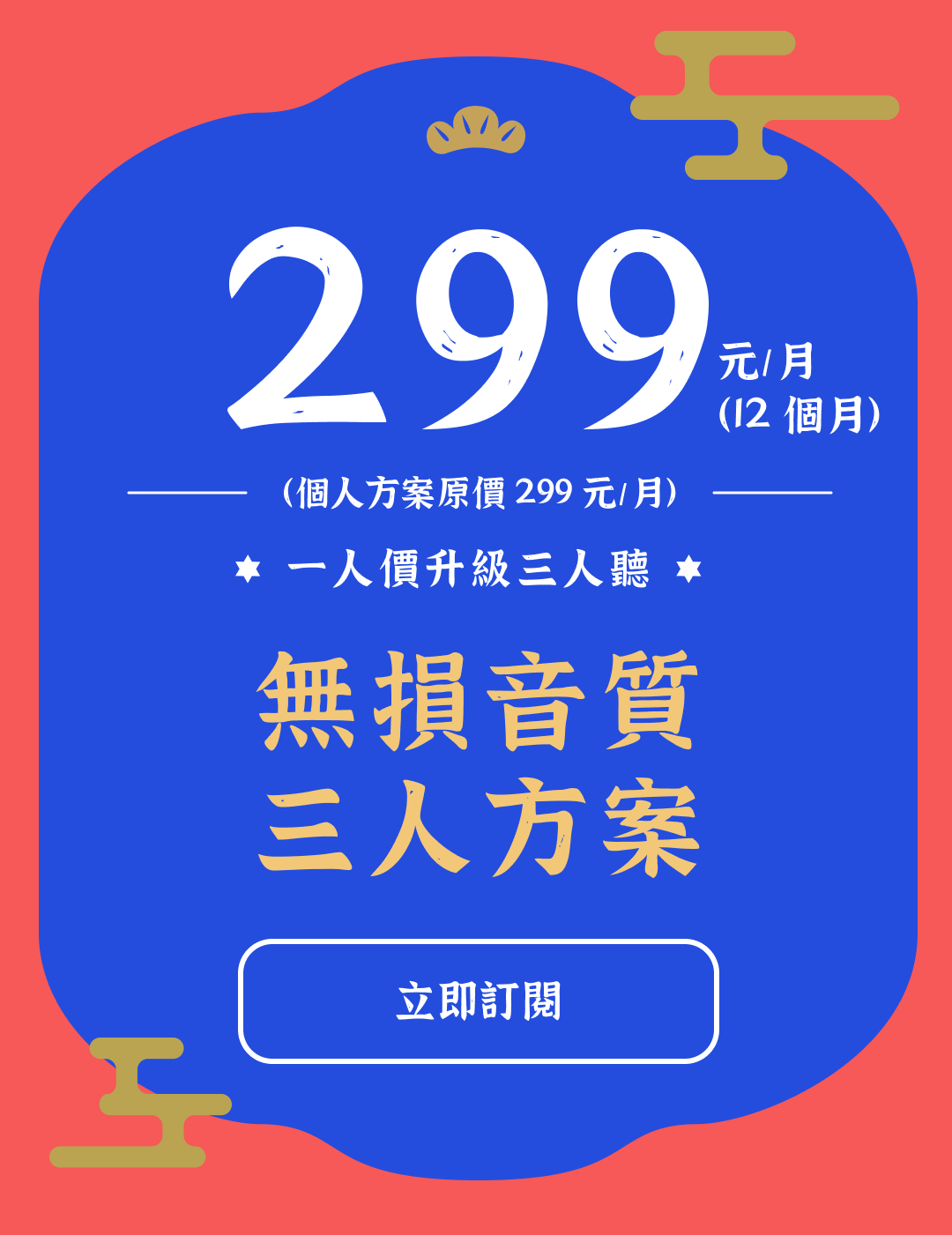 4. 選購本方案即可享有 KKBOX 最高 24bit/192kHz Hi-Res 無損音質月租型服務,訂閱期間將以每月 NT$299 續扣 12 個月,每月享相較原價便宜 NT$61 之折扣,第 13 個月起每月續扣 NT$350;在 12 個月內期間無法退租,須扣款至第 13 個月月費後方可退租