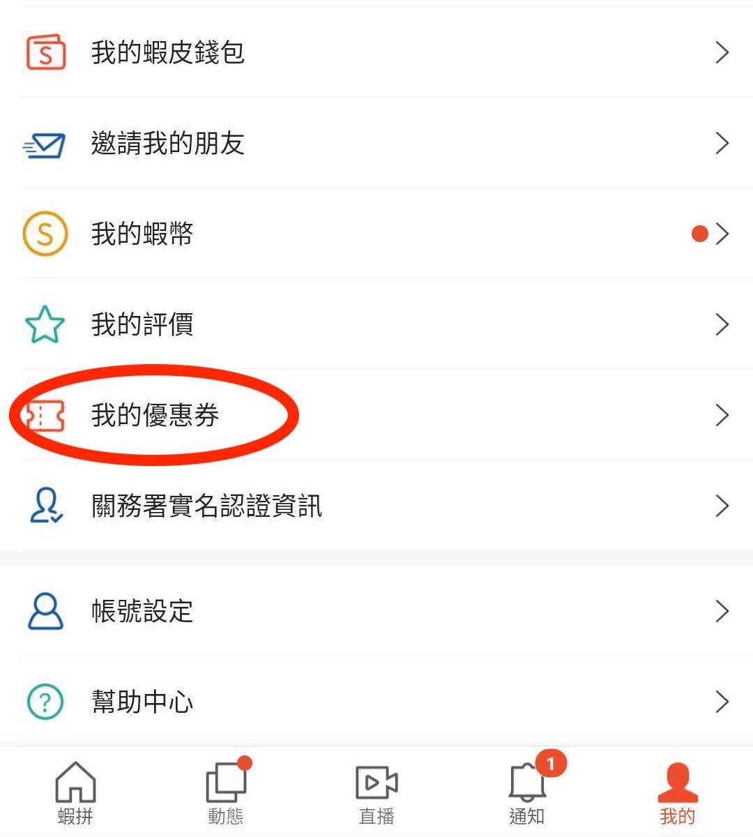1 在蝦皮App將指定商品加入購物車後,到「我的」帳戶,往下滑尋找「我的優惠券」。